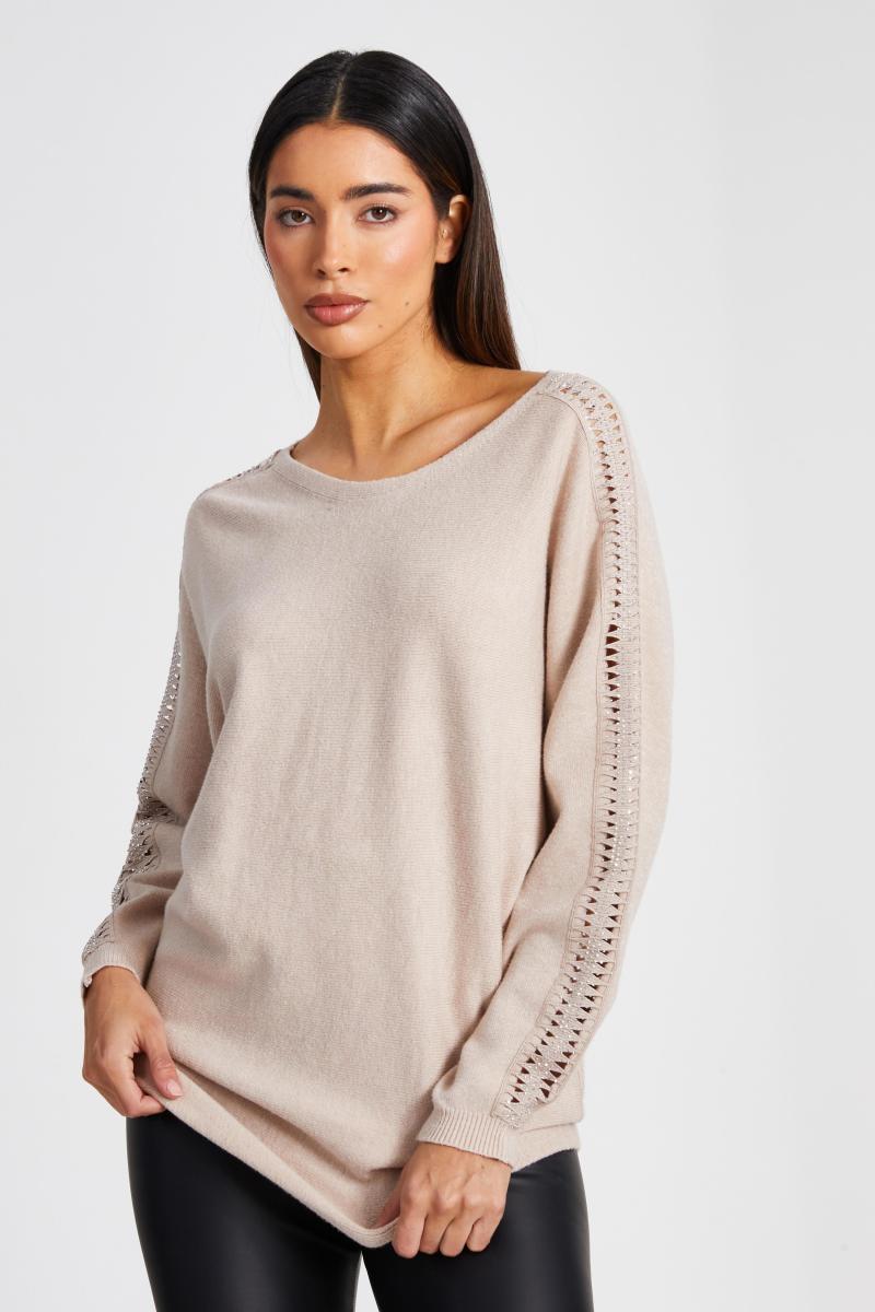 Цей джемпер з довгим рукавом оснащений круглим дизайном шиї з деталями діаманти на рукавах, виготовленим із легкого в’язаного матеріалу для комфорту та універсальності в більш прохолодну погоду.