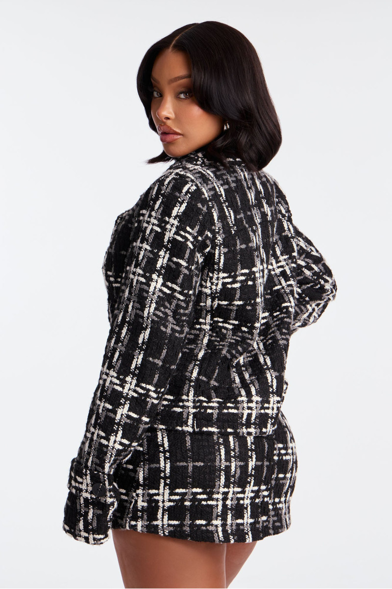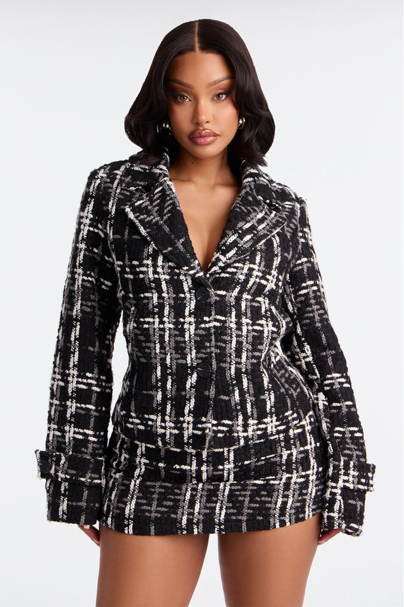 Вишукане укорочене пальто з елегантною твідовою тканиною та коміром. Довгі рукави, застібка на ґудзиках та повністю гладенька підкладка роблять цю модель стильною та практичною. Ідеально пасує до міні-спідниці 'Lady Like' для створення завершеного образу.