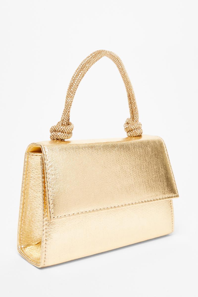 Ця міні -сумка має дизайн верхньої ручки та золоту обробку фольги, що робить її придатною для різних випадків. Його компактний розмір пропонує зручність для перенесення предметів.